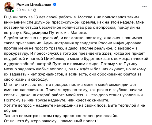 11:43 Тем временем, стало известно, что Роман Цимбалюк, несмотря на наличие аккредитации, решил не идти на пресс—конференцию. Журналист сообщил, что прогнозирует уголовного года.