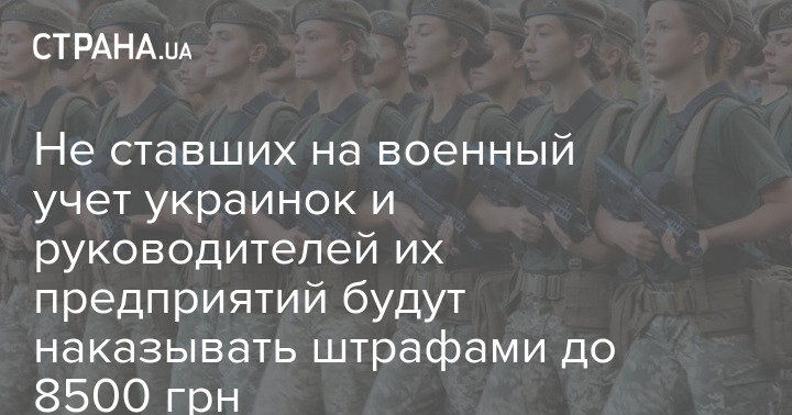 Украинкам, которые в силу своей профессии являются военнообязанными, но не встанут на учет в установленный срок - до конца следующего года, грозит штраф до 1500 гривень. Руководители предприятий, где работают не ставшие на учет женщины, тоже будут оштрафованы.