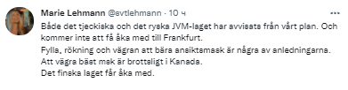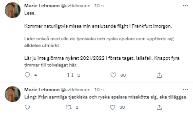 Журналистка шведского издания SVT Мари Леманн на своей странице в Twitter 10 часов назад сообщила о том, что молодых игроков сборных России и Чехии не пустили во Франкфурт из-за их неподобающего поведения.