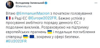 "Поздравляю Эммануэля Макрона с началом председательства Франции в Совете ЕС. Желаю успехов в продвижении амбициозной повестки дня ЕС и преодолении вызовов. Рассчитываем на поддержку европейских стремлений Украины и дальнейшее углубление сотрудничества Украины и Европейского союза, в частности в сфере безопасности", - пишет Зеленский.