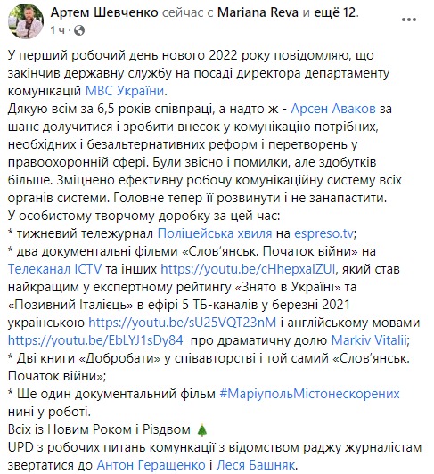 "В первый день нового 2022 года сообщаю, что окончил службу в должности директора департамента коммуникации МВД Украины. Спасибо всем за 6,5 лет сотрудничества, особенно - Арсену Авакову за шанс приобщиться и внести вклад в коммуникацию нужных, необходимых и безальтернативных реформ и преобразований в правоохранительной сфере. Были, конечно, и ошибки, но достижений - больше. Укреплена эффективная рабочая коммуникационная система всех органов системы. Главное теперь ее развить и не погубить", - написал Шевченко.