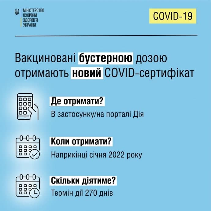 Вакцинированные бустерной дозой получат два новых ковида-сертификата. Техническая возможность добавлять их в "Дию" появится в конце января.