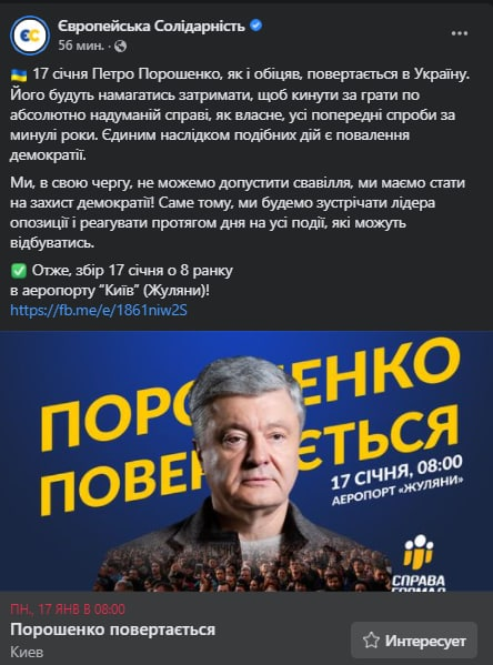Партия "Европейская солидарность" объявила о мобилизации людей для встречи бывшего президента Украины и главы политсилы Петра Порошенко в понедельник, 17 января.