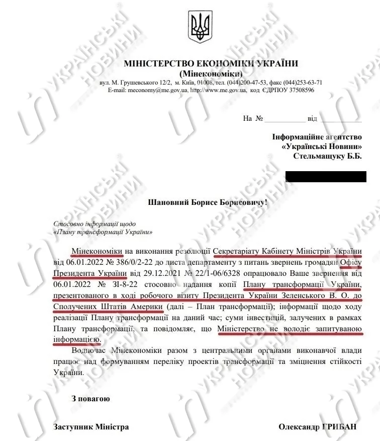 "Минэкономики во исполнение резолюции Секретариата Кабинета Министров Украины от 06.01.2022 №386/0/2-22 к письму департамента по вопросам обращений граждан Офиса Президента Украины от 29.12.2021 №22/1-06/6328 обработало Ваше обращение от 06.01.2022 №ЗІ-8-22 о предоставлении копии Плана трансформации Украины, презентованного в ходе рабочего визита Президента Украины Зеленского В.А. в Соединенные Штаты Америки (далее – План трансформации); информации о ходе реализации Плана трансформации в настоящее время; суммы инвестиций, привлеченных в рамках Плана трансформации, и сообщает, что Министерство не владеет запрашиваемой информацией", - сказано в ответе министерства.