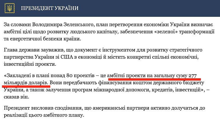 Спустя четыре месяца после визита в Соединенные Штаты Офис президента Украины не может найти план трансформации Украины на $277 млрд грн, который президент Владимир Зеленский официально презентовал инвесторам в Вашингтоне.