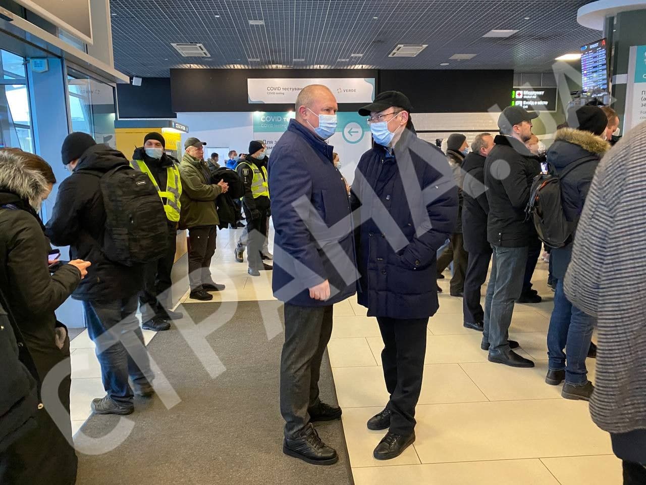 08:40 В "Жулянах" встречающие держат плакаты с надписями "Стране нужен Порох", "Руки прочь от Пороха" и "Стоп репрессиям". На площади перед терминалом прибытия поставили экран.