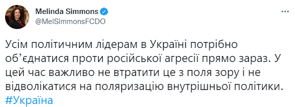 11:08 Посол Британии в минуты посадки самолета Порошенко в Украине призвала украинских политиков объединяться и "не отвлекаться на поляризацию внутренней политики".