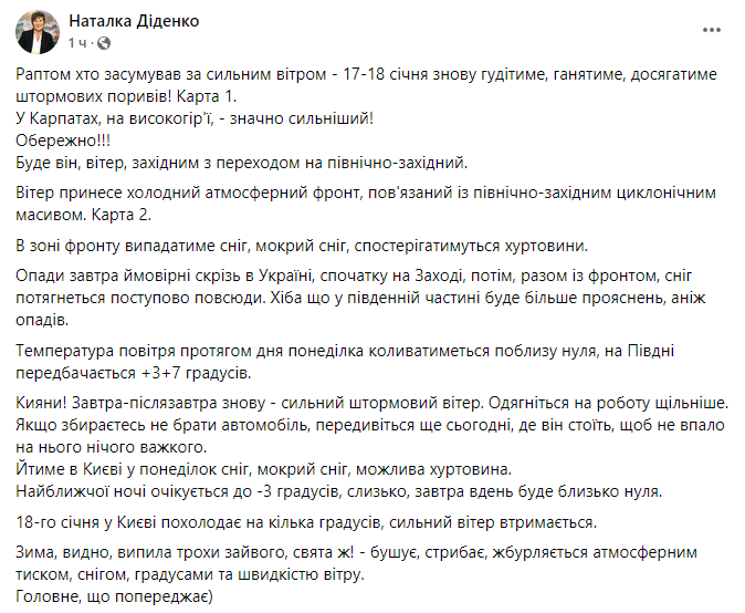 "Оденьтесь на работу плотнее. Если не собираетесь брать автомобиль, посмотрите сегодня, где он стоит, чтобы на него не упало ничего тяжелого", - пишет Диденко.