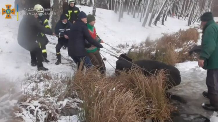 В Сумах сотрудники Государственной службы Украины по чрезвычайным ситуациям спасли корову, провалившуюся под лед замерзшего водоема.