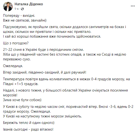 "21-22 января на Украине будет с периодическим снегом. Разве что в южной части без существенных осадков, а также на Востоке в воскресенье преимущественно сухо. Гололедица. Ветер западный, юго-западный, и дальше порывистый!" - предупреждает синоптик.