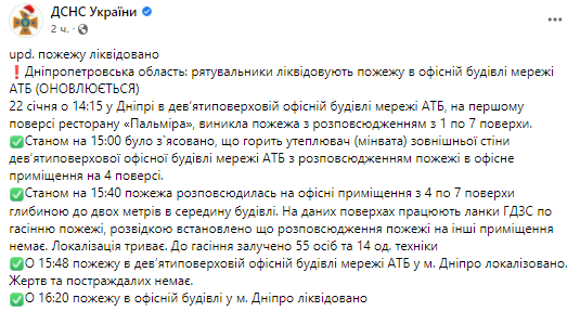 "Сегодня, 22 января, в 14:15 в Днепре в девятиэтажном офисном здании сети "АТБ", на первом этаже ресторана "Пальмира", возник пожар с распространением с 1 по 7 этажи из 9. По состоянию на 15:00 было установлено, что горит утеплитель (минвата) наружной стены девятиэтажного офисного здания сети "АТБ" с распространением пожара в офисное помещение на 4 этаже. Предварительно жертв и пострадавших нет. К тушению привлечены 45 человек и 11 единиц техники", - сообщили в ГСЧС.