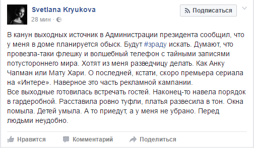 "В канун выходных источник в Администрации президента сообщил, что у меня в доме планируется обыск. Будут #зраду искать. Думают, что провезла-таки флешку и волшебный телефон с тайными записями потустороннего мира.