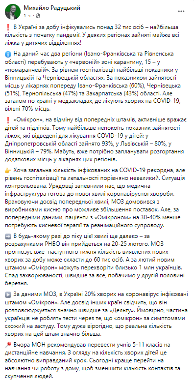 "Минздрав прогнозирует, что уже на следующей неделе число выявленных новых больных за сутки может составить до 60 тысяч человек. А в течение февраля новым штаммом "Омикрон" могут переболеть около 1 млн украинцев. Спад заболеваемости, скорее всего, увидим во второй половине марта", - написал Радуцкий.