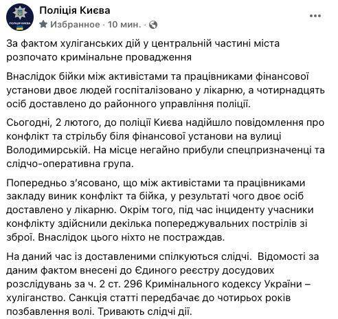 "По факту хулиганских действий в центральной части города начато уголовное производство В результате драки между активистами и работниками финансового учреждения два человека госпитализированы в больницу, а четырнадцать человек доставлены в районное управление полиции.