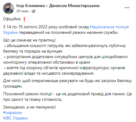"С 14 по 19 февраля 2022 года личный состав Национальной полиции Украины переведен на усиленный режим несения службы.