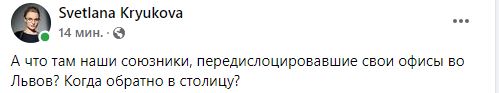 "А что там наши союзники, передислоцировавшие свои офисы во Львов? Когда обратно в столицу?" - также поинтересовалась она.