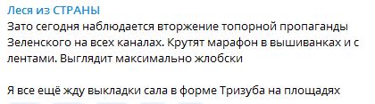 "Зато сегодня наблюдается вторжение топорной пропаганды Зеленского на всех каналах. Крутят марафон в вышиванках и с лентами. Выглядит максимально жлобски.
