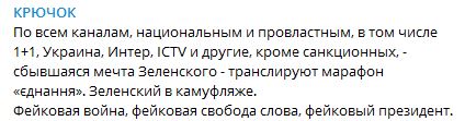 "По всем каналам, национальным и провластным, в том числе 1+1, Украина, Интер, ICTV и другие, кроме санкционных, - сбывшаяся мечта Зеленского - транслируют марафон "єднання". Зеленский в камуфляже. Фейковая война, фейковая свобода слова, фейковый президент" - написала заместитель главного редактора "Страны" Светлана Крюкова.