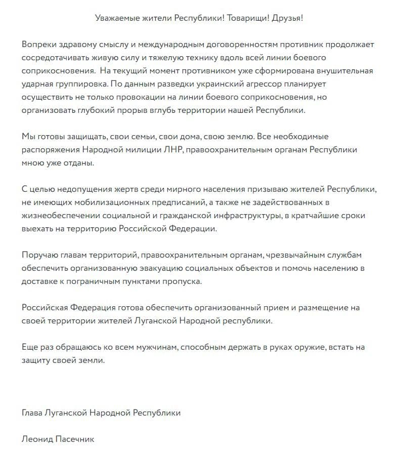 Опубликовано полное заявление "главы ЛНР" об эвакуации населения в Россию с призывом к мужчинам взять в руки оружие.