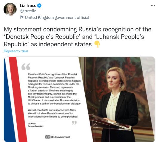 Глава британского МИД Лиз Трасс также заявила, что признание независимости "ЛДНР" означает конец "Минска" и что Путин выбрал путь конфронтации.