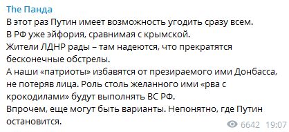 2. Если ВСУ продолжит стрелять на Донбассе, это повод для полномасштабной войны с РФ, учитывая подписанные вчера договора между РФ и самопровозглашенными ЛДНР" - написал журналист Дмитрий Василец.