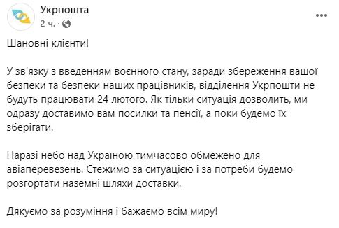 "В связи с введением военного положения, ради сохранения вашей безопасности и безопасности наших работников отделения Укрпочты не будут работать 24 февраля. Как только ситуация позволит, мы сразу доставим посылки и пенсии, а пока будем их хранить.
