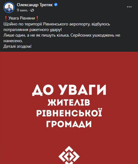 "Только чтоо по территории Ровенского аэропорта произошло попадание ракетного удара! Только один, а не как пишут несколько. Серьезные повреждения не нанесены. Детали со временем!" - написал он.