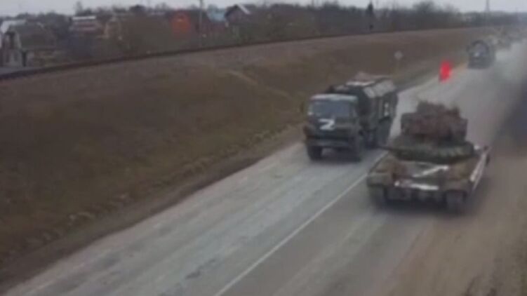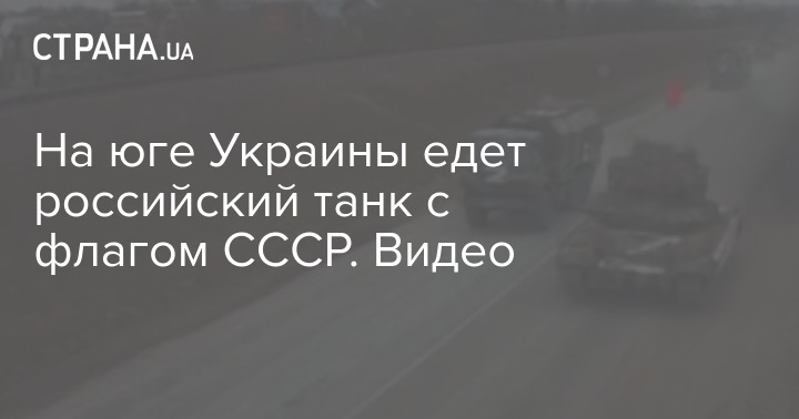 В сети появились видео, на которых запечатлено, как где-то на юге Украины едет российский танк с флагом СССР. Также видна и другая техника РФ, которая следует за ним.