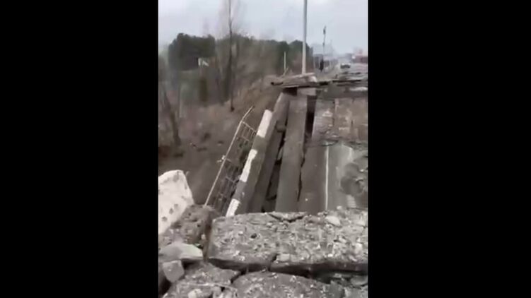В сети опубликовано видео взорванного моста под Вышгородом. Мост уничтожен для того, чтобы затруднить российской технике подходы к Киеву.