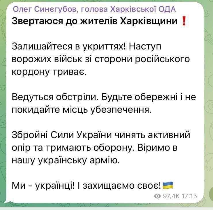 "Обращаюсь к жителям Харьковщины. Оставайтесь в укрытиях! Наступление вражеских войск со стороны российской границы продолжается. Ведутся обстрелы. Будьте осторожны и не покидайте мест безопасности. Вооруженные силы дают активное сопротивление и держат оборону. Верим в нашу украинскую армию. Мы украинцы и защищаем своё", - об этом он написал у себя в Telegram.
