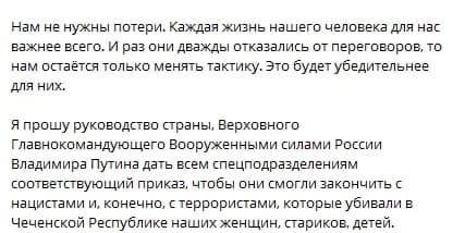 Я прошу руководство страны, Верховного Главнокомандующего Вооруженными силами России Владимира Путина дать всем спецподразделениям соответствующий приказ, чтобы они смогли закончить с нацистами", - заявил Кадыров.