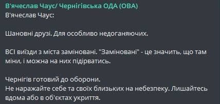 Глава Черниговской ОГА Вячеслав Чаус заявил, что Чернигов категорически нельзя покидать, так как выезды из города заминированы.