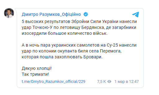 Ночью пара украинских асов на Су-25 нанесли удар по колонне оккупанта возле села Победа, которая шла захватывать Бровары", - написал Разумков в своем телеграм-канале.