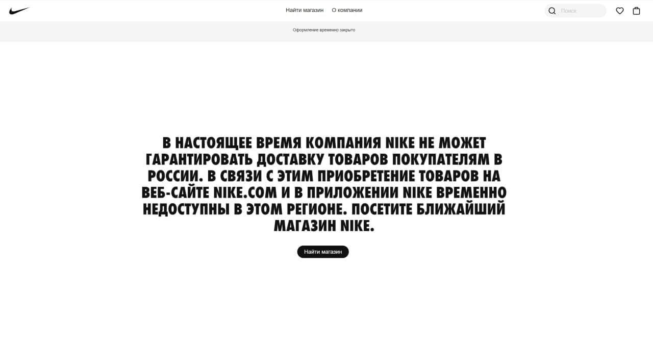 На главной странице российского сайта Nike появилось сообщение, что в настоящее время компания не может гарантировать доставку товаров покупателям в России. "Посетите ближайший магазин Nike", - написано там.