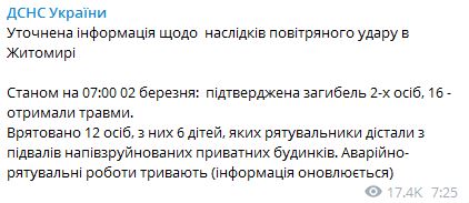 Утром 2 марта спасатели ГосЧС обнародовали уточненную информацию о последствиях вчерашнего воздушного удара в Житомире.