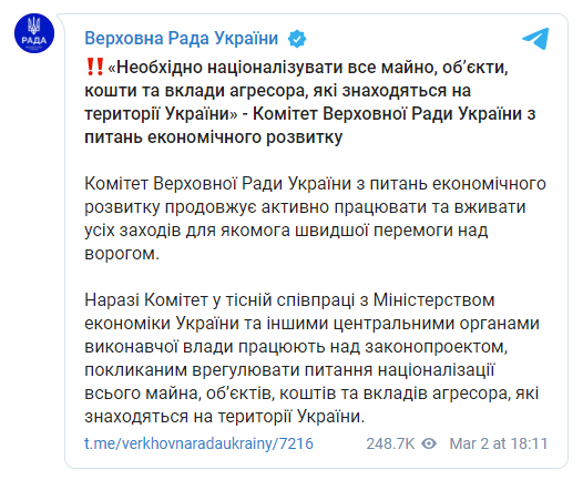 "Необходимо национализировать все имущество, объекты, средства и вклады агрессора, которые находятся на территории Украины", - заявил Комитет Верховной Рады Украины по экономическому развитию.
