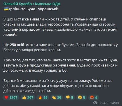 "В совместном сотрудничестве областные и местные власти, тероборона и Укрзализныця создали "зеленый коридор" и вывезли по железной дороге почти полторы тысячи человек. Еще 250 человек смогли вывезти на автобусах. Сейчас их доставляют в безопасность в западные регионы страны", - говорится в сообщении.