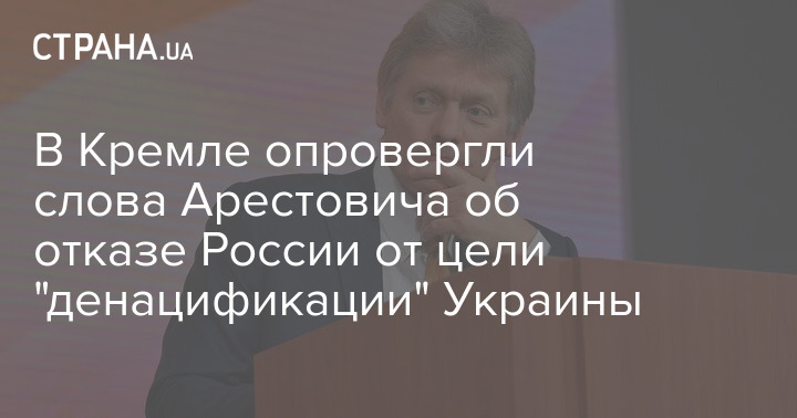 Пресс-секретарь Владимира Путина Дмитрий Песков опроверг, что Россия на переговорах с Украиной отказалась от цели "денацификации", как это сегодня заявлял советник главы Офиса президента Алексей Арестович.