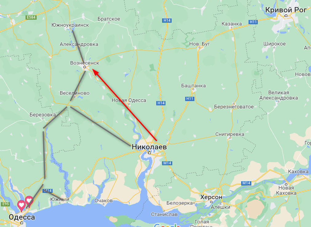 Где - не указывалось. Но речь вполне могла идти именно об этом участке, где естественной преградой для РФ стала речка Южный Буг. Именно через нее мост у Вознесенска, который вчера взорвали. Не исключено, что понтоны наводят южнее этого города, чтобы "выскочить" на трассу без штурма Вознесенска.