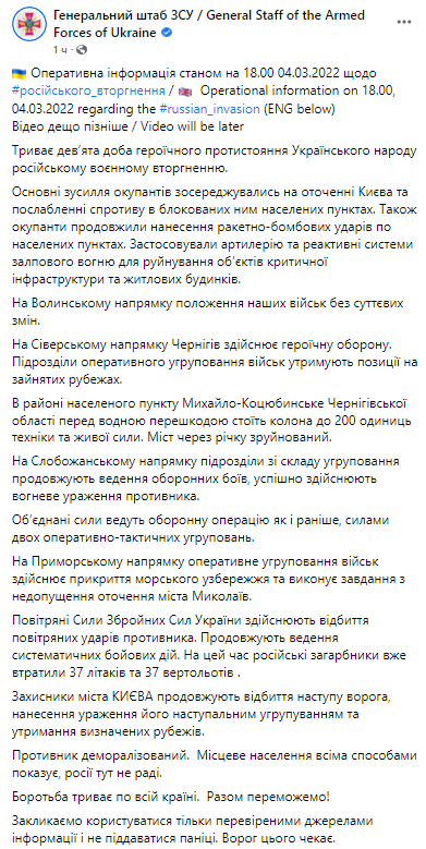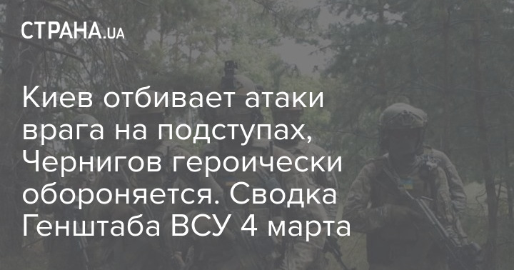 По данным Генерального штаба Вооружённых сил Украины, сегодня, 4 марта, основные усилия оккупантов сосредотачивались на окружении Киева и ослаблении сопротивления в блокированных им населенных пунктах. ВСУ также сообщают, что в город Чернигов осуществляет героическую оборону, а в Киев продолжает отбивать атаки врага.