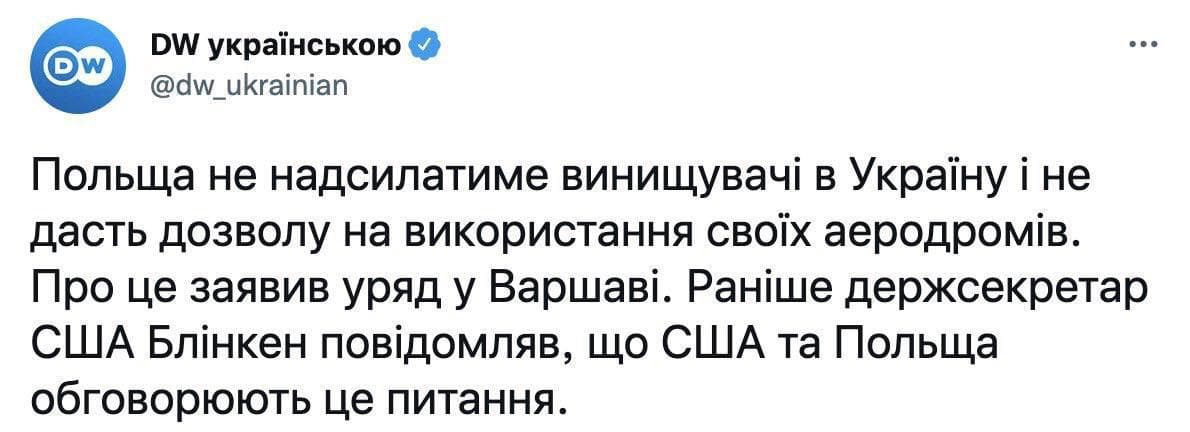 Позже появилась информация из Варшавы, из которой следовало, что с самолётами из Польши вышло все не так, как многие поняли из слов Блинкена про "зелёный свет" для поставок истребителей в Украину.