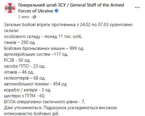09:52 Данные по потерям войск РФ на утро 7 марта (от Генштаба ВСУ)