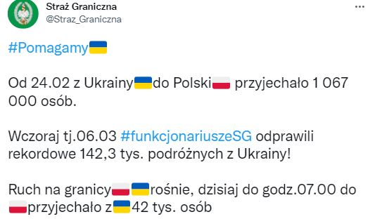 10.17 С 24 февраля из Украины в Польшу выехали 1 067 000 человек. Только 6 марта, польскую границу пересекли 142,3 тыс. украинцев, сообщает Пограничная служба Польши в Twitter.