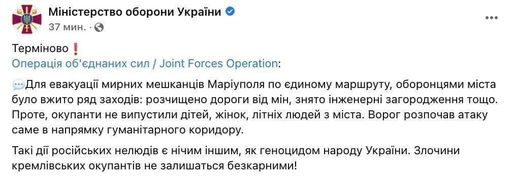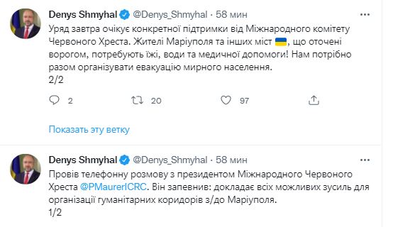 20:55 Правительство рассчитывает на то, что завтра Красный крест поможет в организации гуманитарных коридоров из Мариуполя, - сообщил Денис Шмыгаль.