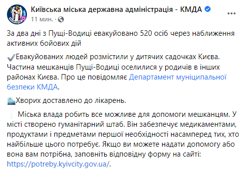 11:10 За два дня из Пущи-Водицы эвакуировано 520 человек из-за приближения активных боевых действий.