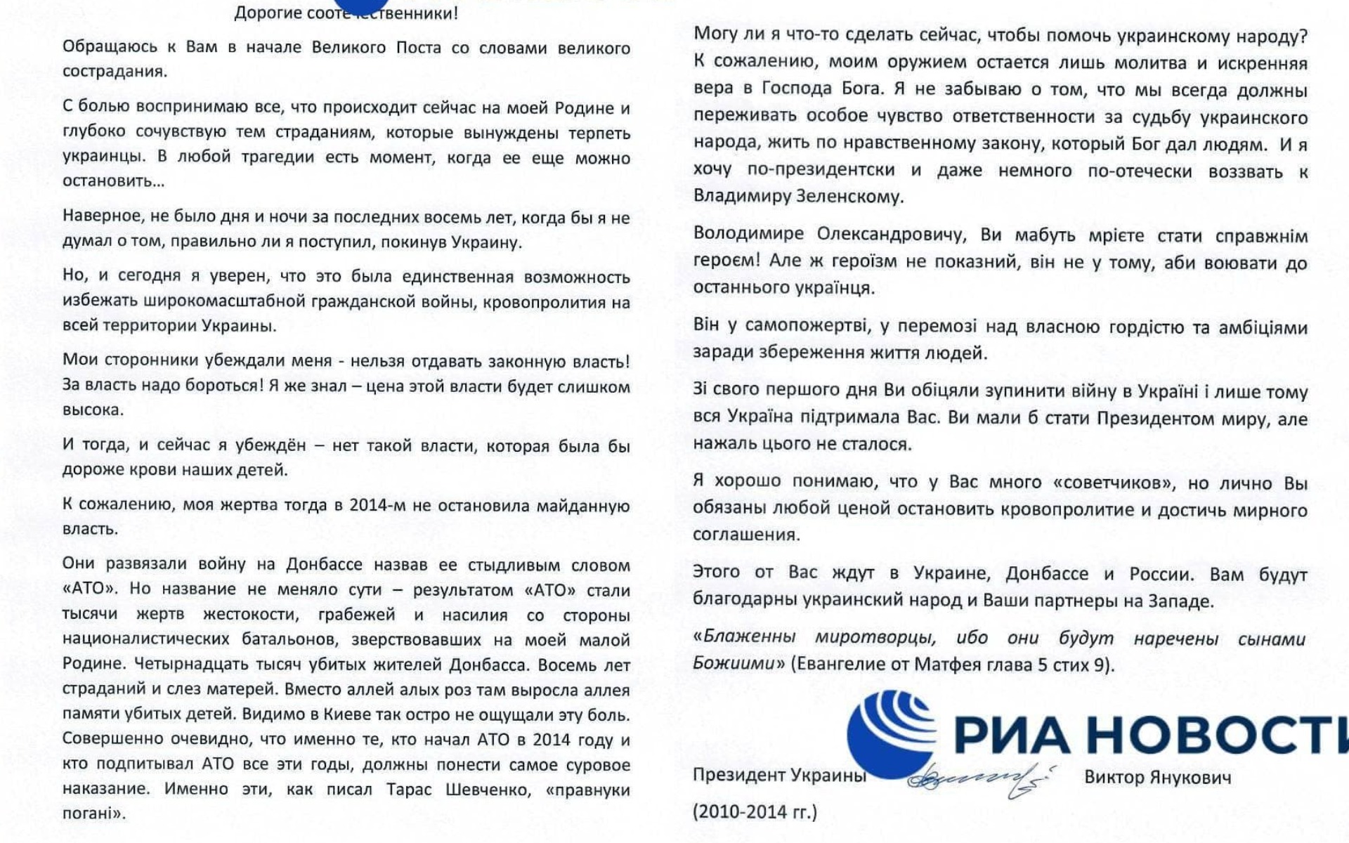 09:09 Вот полный текст обращения Януковича к Зеленскому и украинцам.