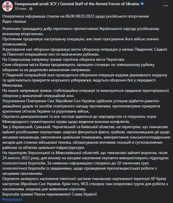 07:46 Генштаб ВСУ опубликовал утреннюю сводку с фронта 8 марта. Сообщается, что противник продолжает наступательную операцию, но темп продвижения его войск значительно замедлился.