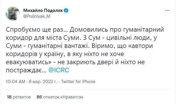 10:16 "Попробуем еще раз..." - Подоляк о гуманитарном коридоре из Сум.