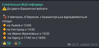 Во вторник, 8 марта, из Краматорска отправляются поезда: