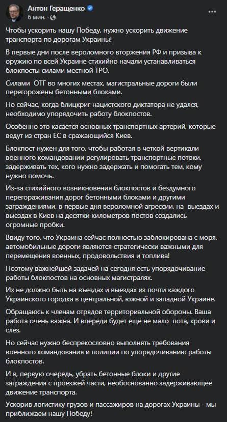 10:44 Советник главы МВД Антон Геращенко призвал тероборону убрать бетонные блоки с дорог около блок-мостов и перестать создавать многокилометровые очереди из авто.